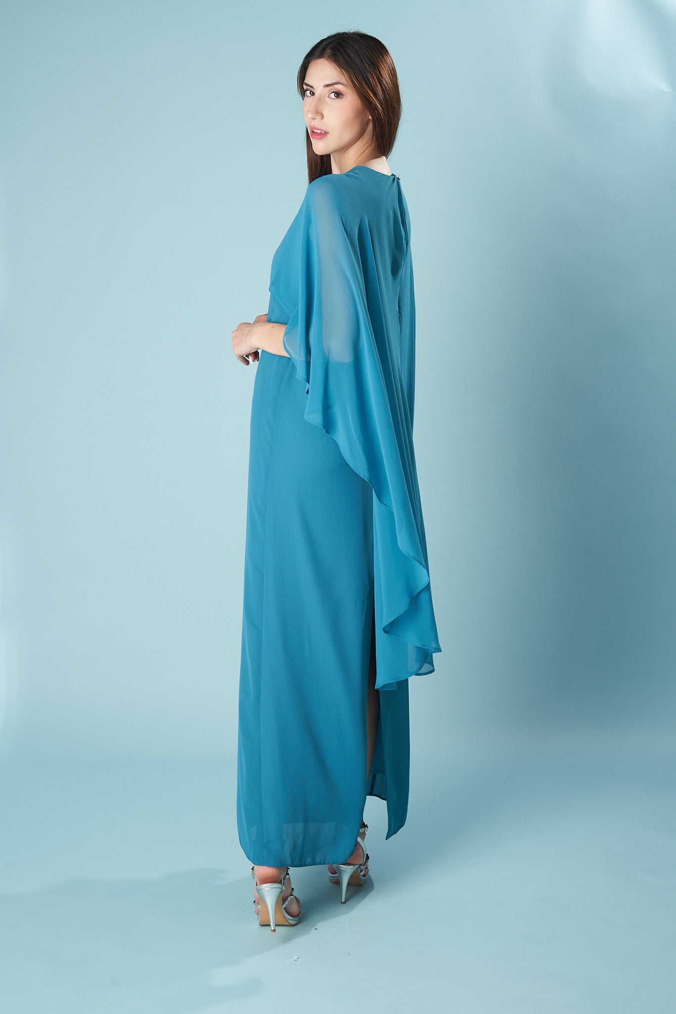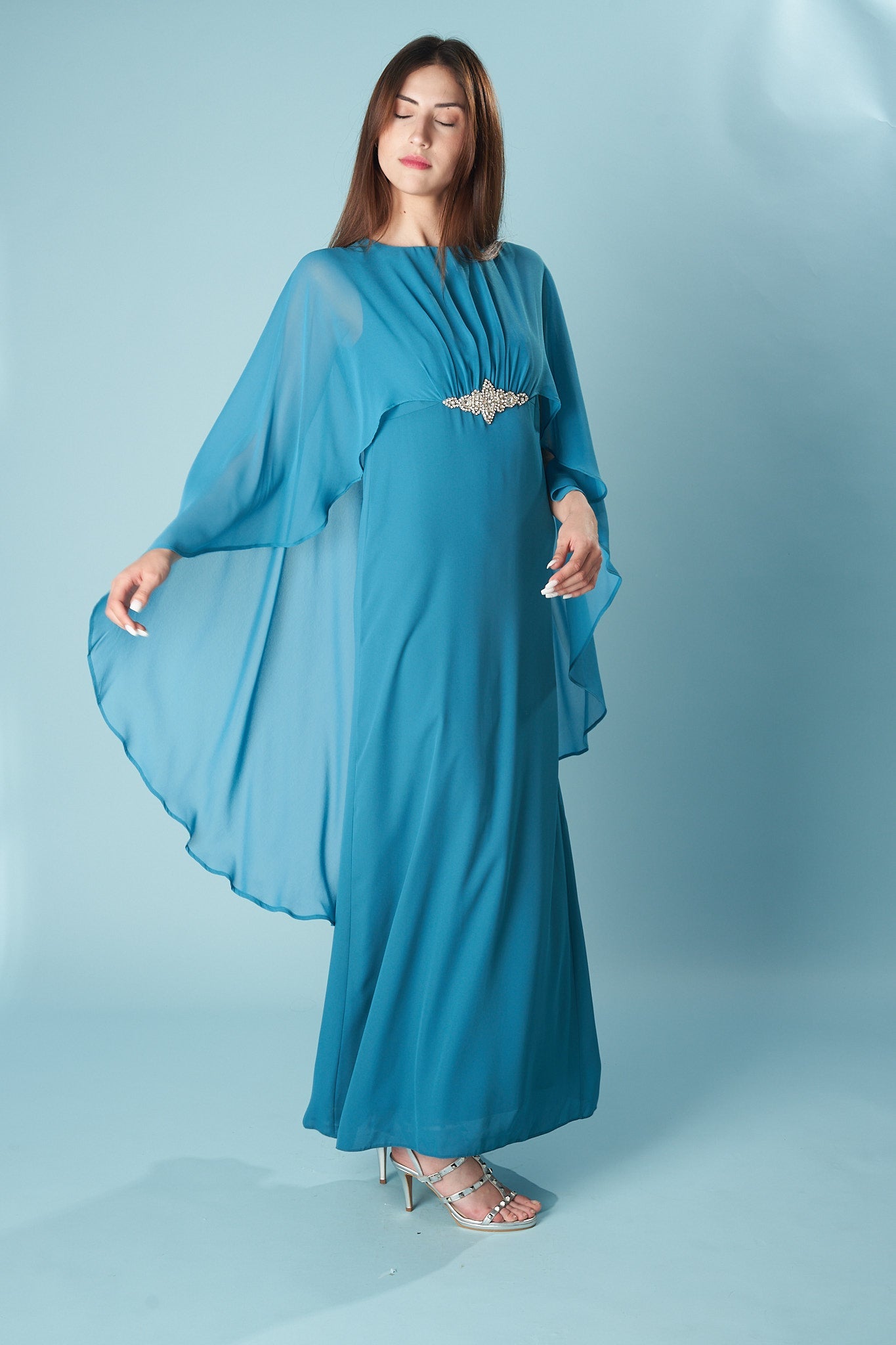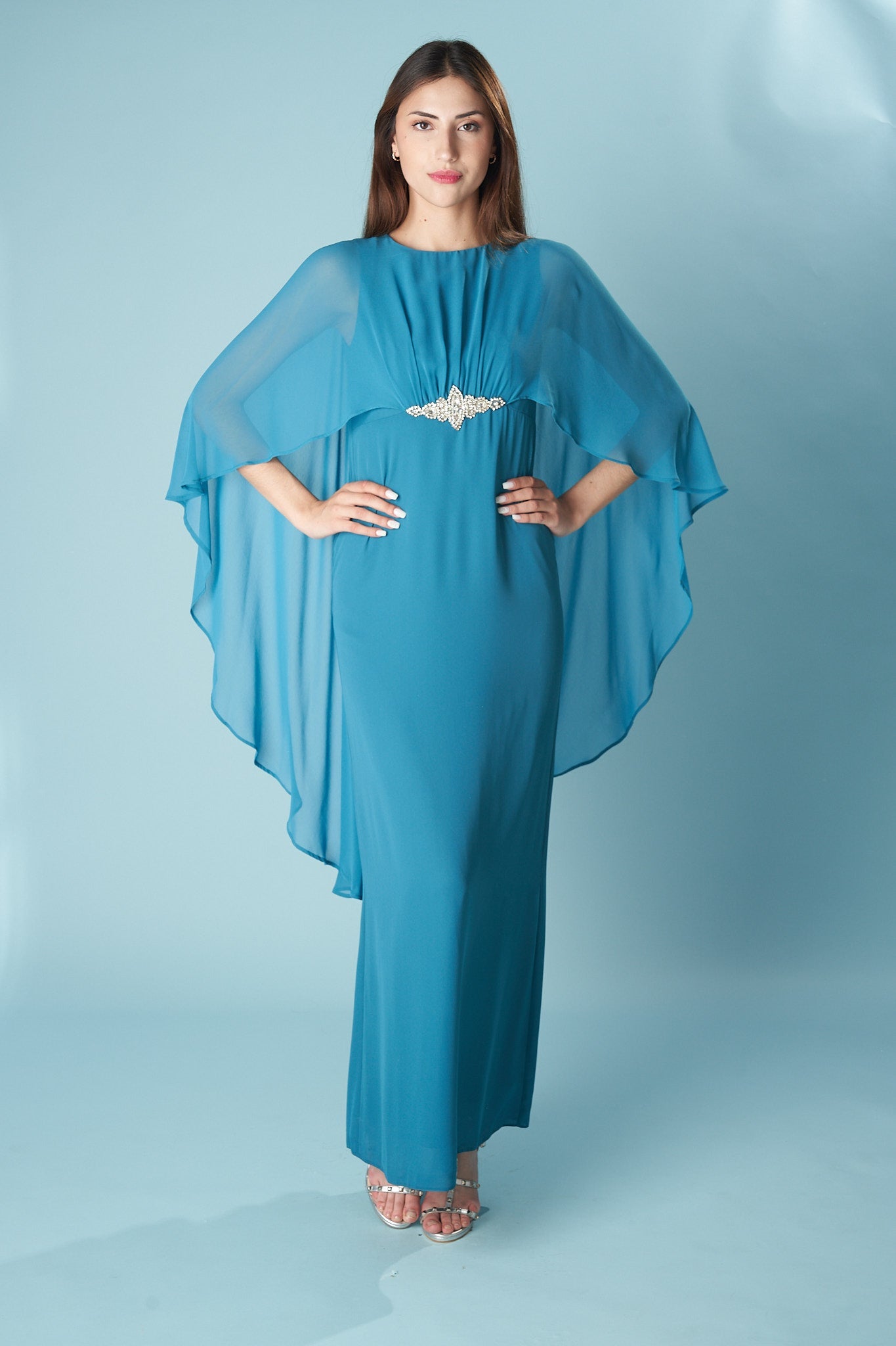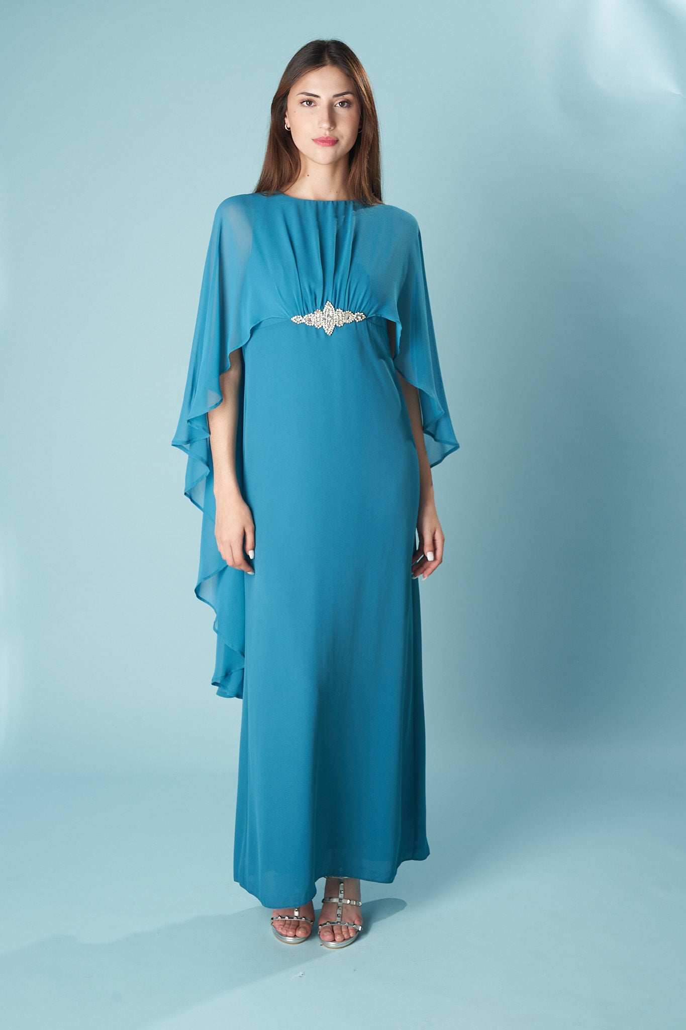 Vestido largo con capa de gasa vaporosa integrada que cae desde los hombros, creando un efecto etéreo y elegante. Su silueta recta estiliza la figura, mientras que el detalle joya en el centro del pecho aporta un toque de sofisticación atemporal. Ideal para invitadas que buscan una pieza distinta, fluida y con presencia. Hecho con materiales locales en talleres españoles.