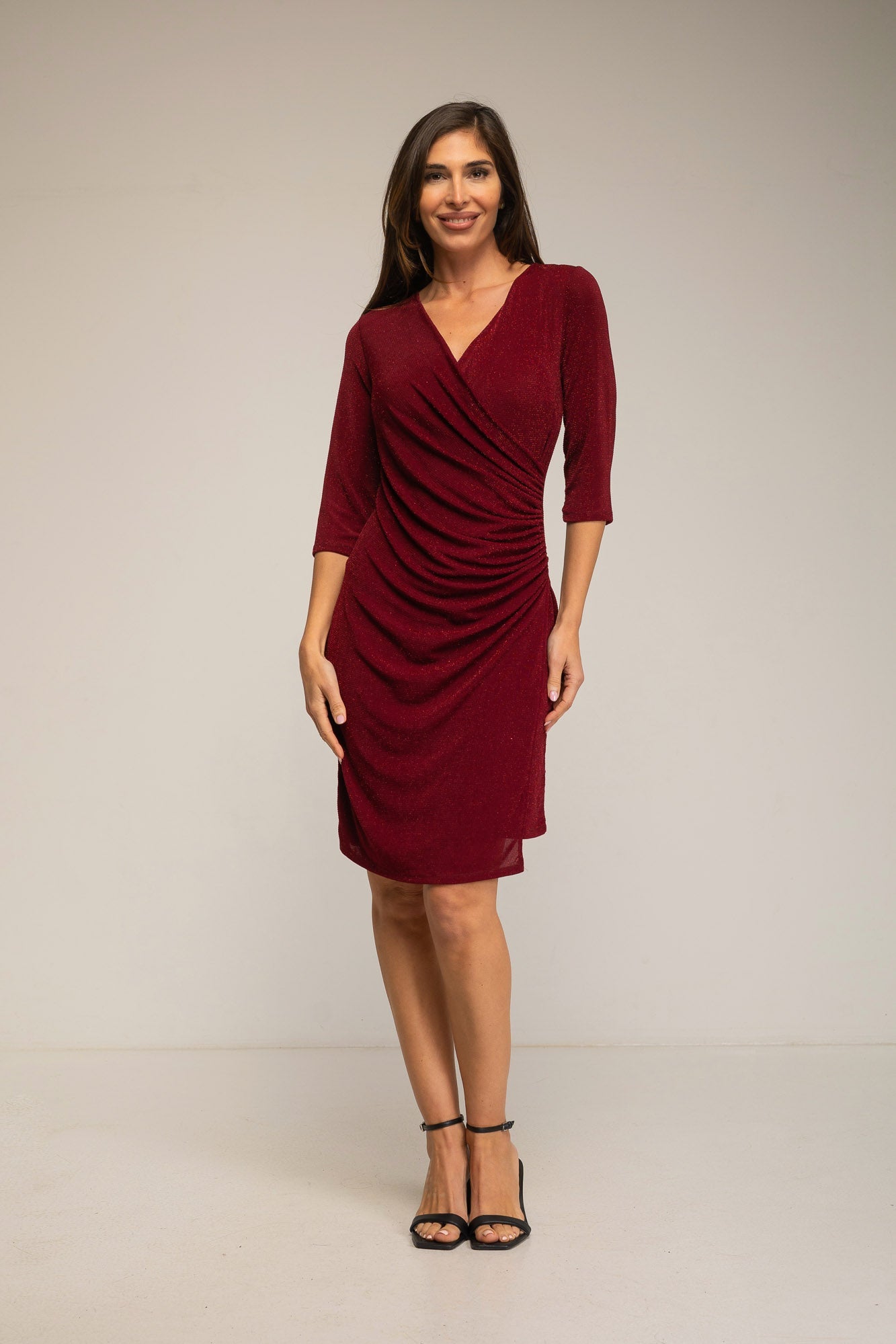 Vestido corto con drapeado lateral. Escote pico cruzado. Manga 3/4